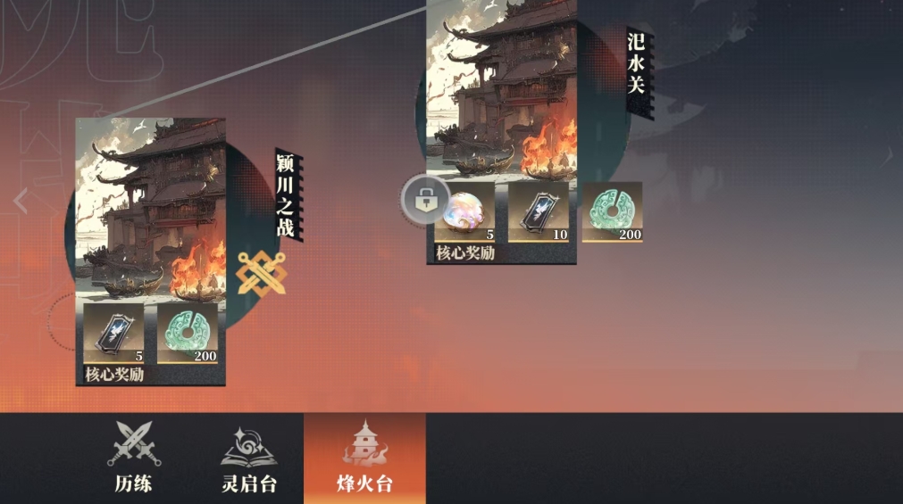 灵启台同样是一个获取三山壁的途径,而烽火台则是后期解锁的玩法,这个玩法当中跟灵启台一样是关卡战,所以三山壁也可以在这里获取,也就是说历练当中有很多此道具获取的模式,甚至在游戏的前中期这个地方可以说是主要获取三山壁的活动之一。
