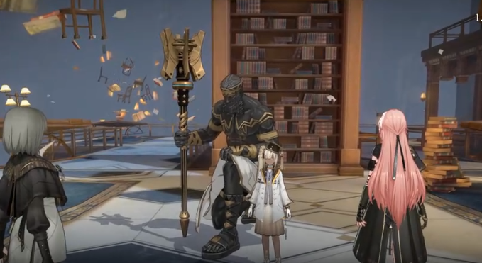 在游戏的第一个章节中,玩家需要进入到巴别图书馆,只有完成这个图书馆的探索任务之后,才能进入到下一个挑战中,首先玩家在进入这里之后需要先从平台向前出发,行走一段距离之后,可以看到旁边有楼梯,需要沿着这个楼梯向上,然后借助这个穿梭点可以来到下一个场景,在这个场景中,玩家依旧需要沿着道路继续向前,接着会来到书架旁边,在这里会出现一些小怪玩家需要优先使用技能攻击这些怪物,接着在击杀怪物之后,可以看到这里有一个宝箱,玩家可以把这些宝箱都收集起来。