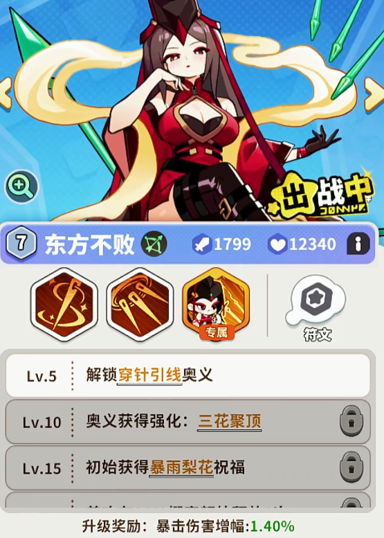 东方不败则采用高频单体突刺体系,以金针为载体进行极速连击。其普通攻击每秒可释放十余次穿透性飞针,虽无范围扩散效果,但单目标伤害累积速度快、命中稳定,对中小型波次敌人及高血量BOSS均有良好压制表现。该角色不具备传统意义上的群体清图能力,但在持续单体输出场景下,伤害稳定性与资源利用率明显优于多数同类角色。