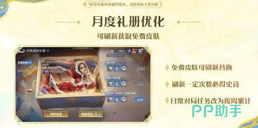 如果你是喜欢月度福利的玩家,那么S41赛季的月度礼册优化一定不会让你失望。不仅免费皮肤可以根据自己的需求进行刷新,甚至还加入了史诗皮肤的必得机制,让你不再为了保底而苦等三个月。任务难度也降低了,日常对局的任务将按周累计,这也减轻了不少肝玩家的压力。