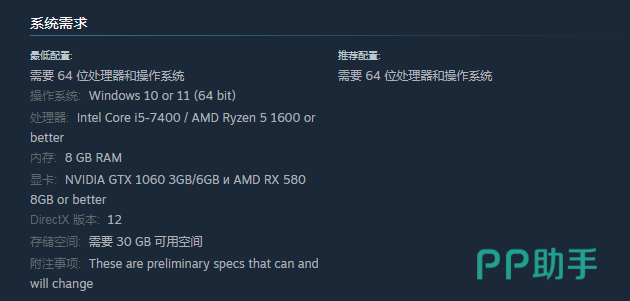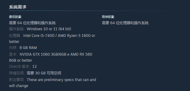 在操作系统方面可以选择Windows 10 or 11 (64 bit),处理器是一个比较重要的内容,建议玩家选择Intel Core i5-7400,另外在显卡这一方面也是很有优势性的。显卡尽可能选择6GB и AMD RX 580 8GB or better