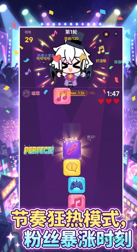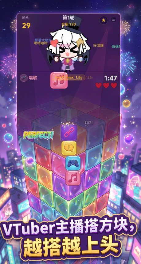 游戏上手门槛极低,单指滑动即可完成方块放置与消除,但深度并未因此削弱:每一轮堆叠均需预判落点、权衡空间利用率,并在随机触发的三十多种Buff效果中快速决策最优组合。例如“磁吸加速”可延长滞空时间,“连击强化”能提升狂热模式激活效率,“镜像复制”则带来双线操作可能。这种“易学难精”的设计,既满足碎片化娱乐需求,又为进阶玩家保留策略博弈空间。值得一提的是,连续无失误堆叠将实时触发“完美”提示并累积狂热值,进入高速响应状态后,方块下落节奏加快、得分倍率跃升,配合主播情绪反馈与弹幕互动动画,形成强正向反馈闭环。