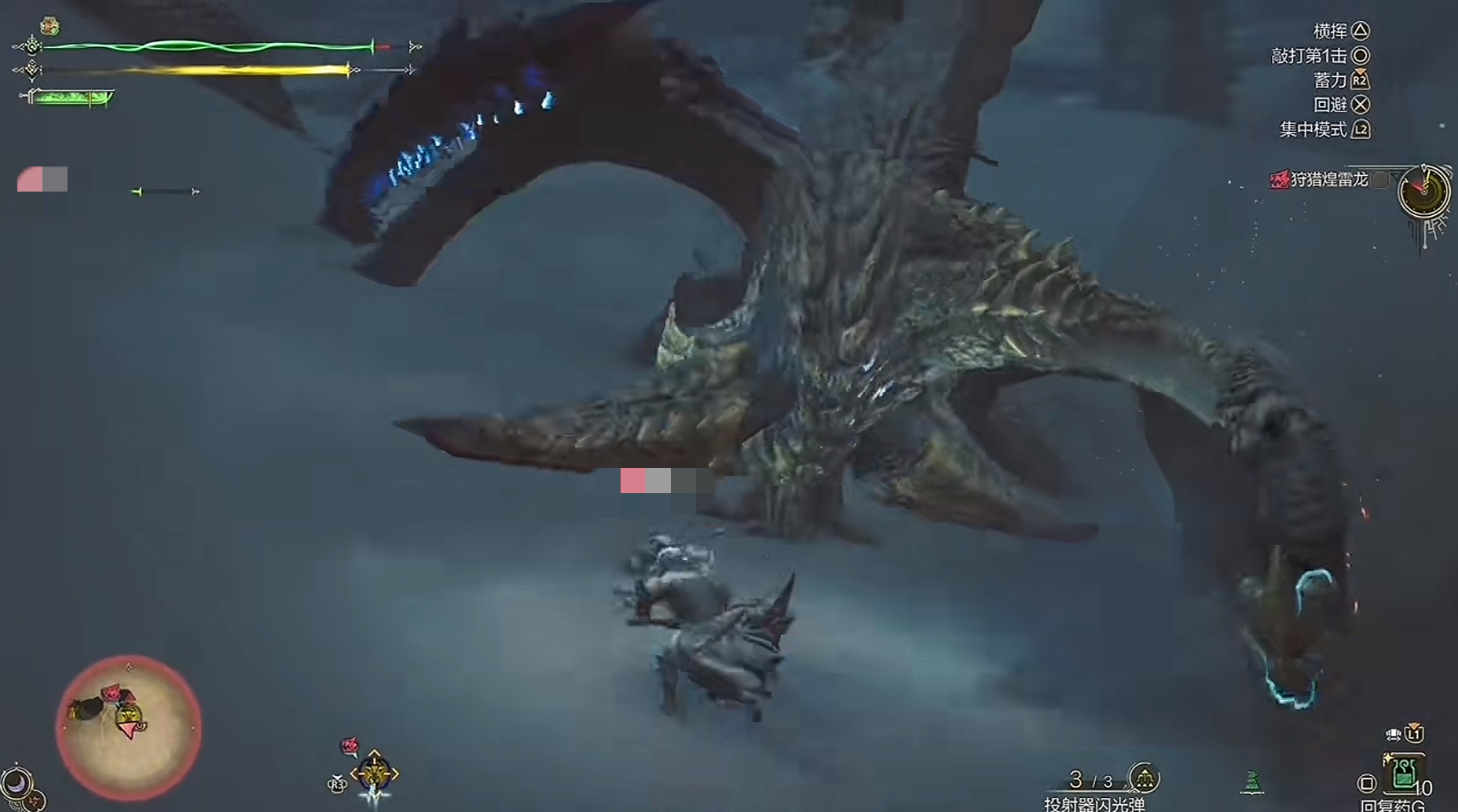 再来看折纸龙的远程释放招式,分别就是朝挑战者位置释放电流,以及三次点击,注意第二个招式前两下电击会调整位置;最让玩家头疼的还是怪物飞起来之后使用左右翅膀插入地面冲向玩家,只要注意走位的时候不要靠近雷电场即可;最后就是空中砸尾这个招式,飞向空中一段距离,然后朝地面猛砸尾巴,不要看怪物在原地僵直就要贪刀,这个招式是一定要躲的。