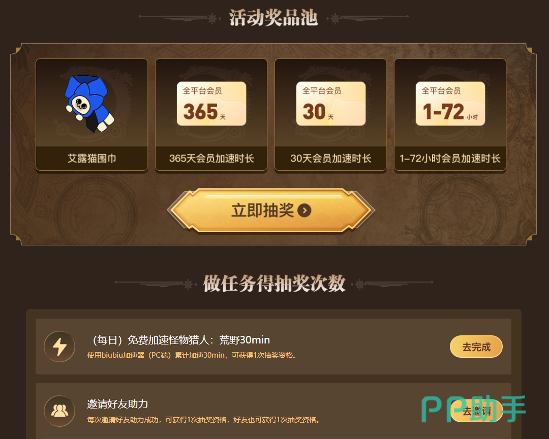 目前biubiu在2月7日~17日开启了为期十天的限时免费加速怪猎活动,在此期间每天使用都可以获得抽奖机会,除了能够免费获得怪猎本体包之外,还有实物周边以及长达一年的免费会员加速时长等待玩家领取,通过邀请好友还能获得更多的抽奖机会哦。如果已经是老玩家的话经常感觉到炸房或者出现这种折纸龙的情况,也可以使用上面的加速工具试试。