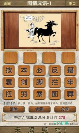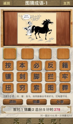 这是一款极具创意与趣味性的益智类手游,为成语爱好者们开启了一场精彩绝伦的文化之旅。游戏以中华成语文化为核心,玩法丰富多样,令人应接不暇。在看图猜成语关卡中,玩家需凭借敏锐的观察力,从生动有趣的图片里找出线索,猜出对应的成语;成语接龙环节则考验玩家的反应速度和成语储备量,要在短时间内想出合适的成语延续接龙。游戏画面清新雅致,音效轻松愉悦,营造出舒适的游戏氛围。