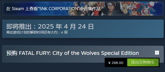 现在已经进入到预购的阶段,玩家可以登录steam平台去预购,价格为268元。有兴趣就可以把游戏放入到购物车内,等到游戏上线就可以去体验。