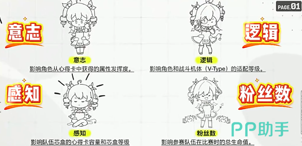 新手期需重点理解四大基础属性的作用逻辑:意志影响技能稳定性,感知决定攻击命中与暴击率(本质为武器系统效能),逻辑调控技能冷却与连携响应速度,粉丝数则直接换算为角色初始生命值。其中感知与粉丝数为优先培养项——前者关系到输出下限,后者决定容错空间。装备系统依托“芯盒”容器实现模块化装配,每个槽位支持嵌入一张心得卡,按功能分为属性提升型、技能触发型、特性强化型三类,分别对应四大属性的成长路径。获取心得卡时,若侧重特定角色的专属技能释放频率,应优先选择技能触发类卡片。