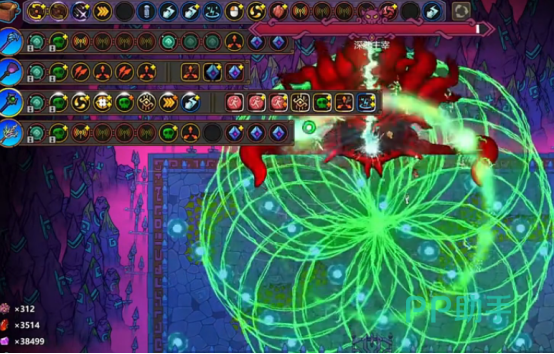 召唤系法术同样种类繁多,克总具有显著的穿透效果,啵啵则能持续生成无限召唤单位,自行魔导书可在无需操作的情况下自动释放法术,结痂后其射击范围和效率全面提升。光之柱属于防御型召唤物,能够有效拦截来自四面八方的弹幕攻击。增益类法术也极具战略价值,多重射击可直接增加发射数量,显著提高输出频率;范围增强能扩大AOE作用区域,与黑洞等控制技搭配使用时效果尤为突出;伤害强化则提供直接的数值加成,简单高效。
