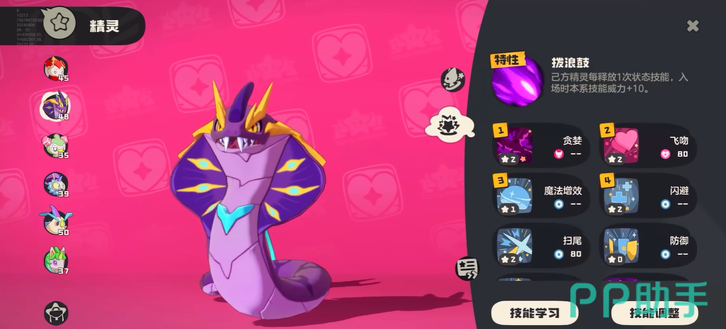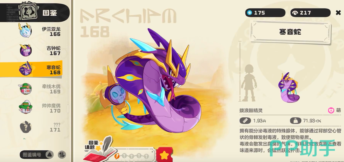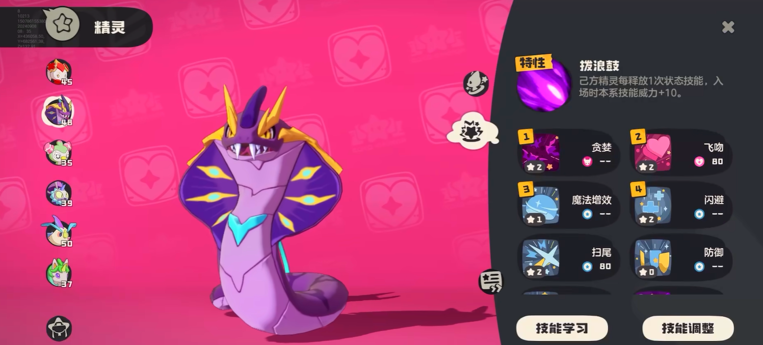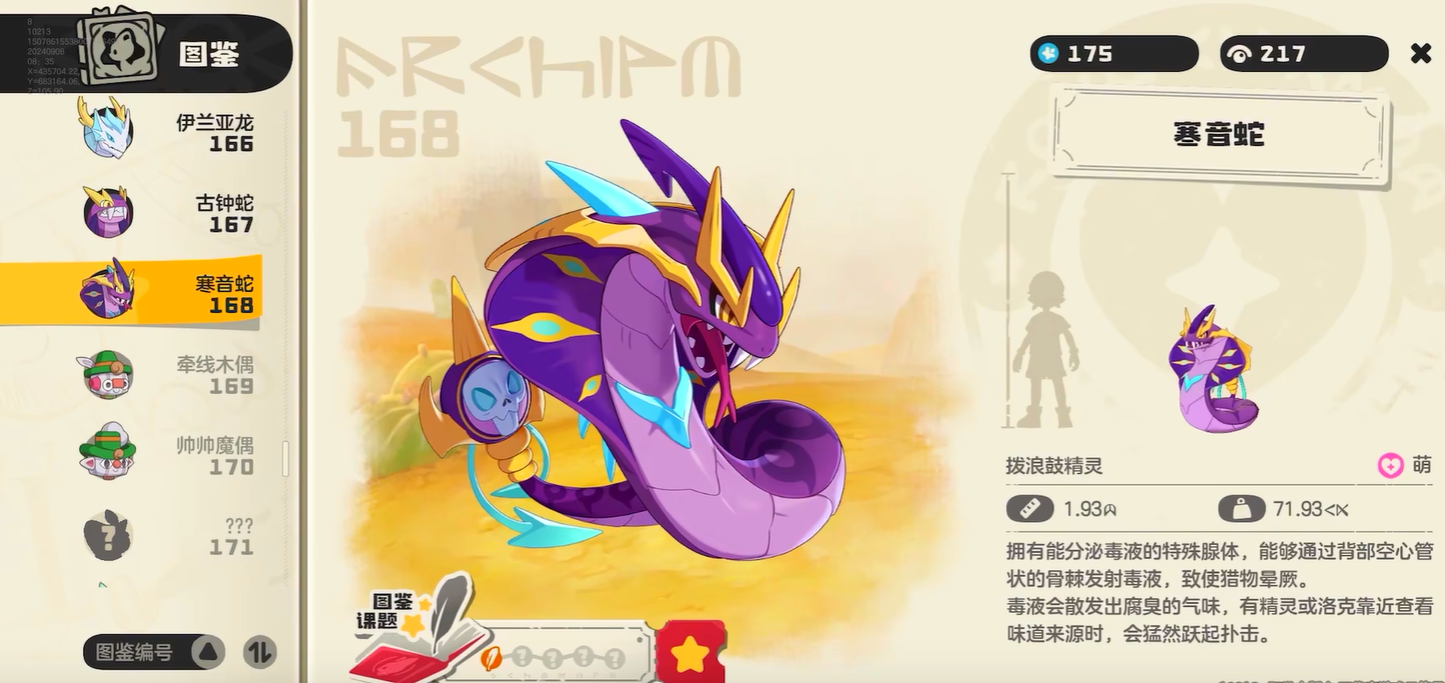 寒音蛇属于目前版本精灵排名中处于T0级别的存在,毒属性攻击能是猎物短暂晕厥。种族值处于上位同时速度值非常高,在作为坐骑时移速跑图非常方便。同时初始面板就很高,进攻防守双端的战力都属于极高的状态。寒音蛇的特性是拨浪鼓,己方每释放一次状态技能,本系列技能威力+10,因此只要叠加几次后输出就会非常高,能够收割全场的存在。