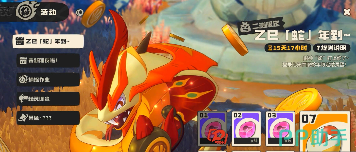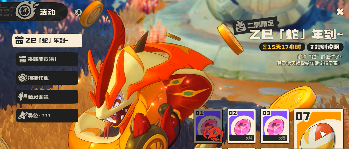 财神蛇是目前4月新出的限定活动,登录七天就能领取限定精灵蛋。财神蛇实际上就是寒音蛇和古钟蛇的限定进化版本,签到七天后在乙巳蛇年奖励中即可领取。古钟蛇也是属于寒音蛇的变种类型,外观技能都稍有差异,获取的方式可以通过野外捕获和活动奖励。在暗黑领突袭活动中成功完成一次突袭即可获得古钟蛇的蛋。战斗技能拥有暗黑诅咒,释放后造成伤害的同时还会降低对方移速,提高自身魔攻魔抗。