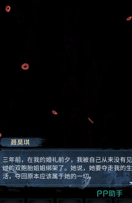 玩家将跟随聂莫琪的视角,在现实与梦境交织的恐怖氛围中,探索双胞胎姐妹的宿命纠葛。相亲剧情始于聂莫琪的梦境,她在梦中与宁子服举行婚礼,却突然被红衣小女孩打断。这段梦境实际是姐姐聂莫黎的怨念投射,暗示三年前冥婚事件的延续。玩家需在梦境中完成“剪红绳”解谜,用剪刀剪断缠绕小女孩的树藤,触发回忆片段。回忆中,父母因村中迷信被迫遗弃姐姐,埋下仇恨种子。现实线中,聂莫琪前往医院产检,却误入废弃的旧二院,这里的时间停滞在18点46分,收音机播放着扭曲的童谣找朋友,自助机需输入“58339”才能打开木门,进入第一个正式解谜场景。