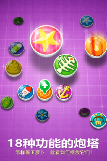 这款游戏中,你需要护住萝卜,不让它被吃掉。游戏的怪物品种丰富,一个关卡里会来好几波怪物,而你要在他们经过的途中放置各种炮塔,来袭击灭杀他们。游戏绝对会为你准备相当丰富的关卡,你无需担心玩塔防不过瘾。游戏还内置了10秒钟的教程,让你快速上手,蜕变为老玩家。游戏关卡数量不少,大家玩起塔防能玩个志得意满。