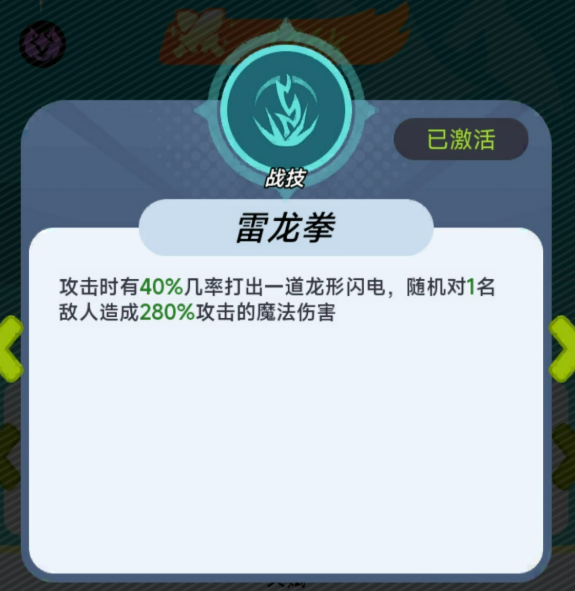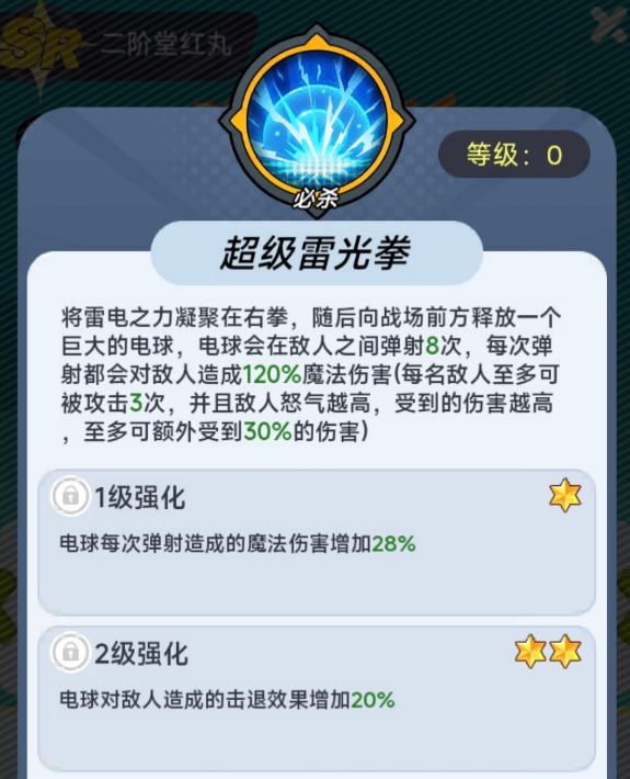 核心主动技“超级雷光拳”呈现为向前推进的电球形态,基础伤害稳定,且具备强制后退效果;随技能等级提升,不仅总伤提高,怒气消耗反而降低,并额外附加眩晕控制——这一设计显著强化了中后期团控节奏的掌控力。“雷龙拳”则作为普攻衍生技,触发概率固定,命中后造成魔法伤害并扣除目标怒气值,对依赖高怒气释放终结技的敌方主力(如大蛇、八神等)形成有效反制。