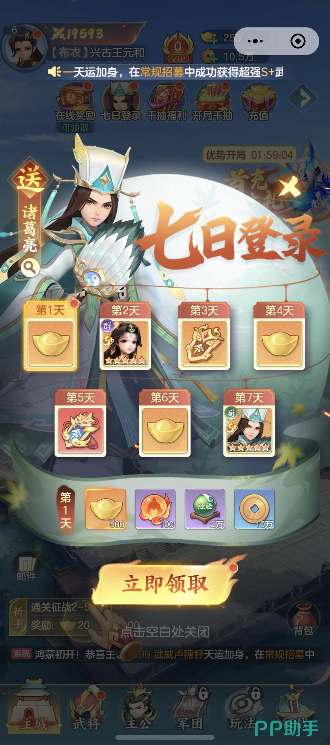 除了首充福利外,游戏还为新玩家准备了多项成长型奖励。其中,全新登录礼包面向所有新手开放,包含大量实用资源。随着角色等级提升,礼包奖励也会逐步解锁。当主公达到20级时,即可领取洗髓丹、一品归元丹、一品凝神丹,以及5000铜板和30级专属新手礼包,持续助力成长。