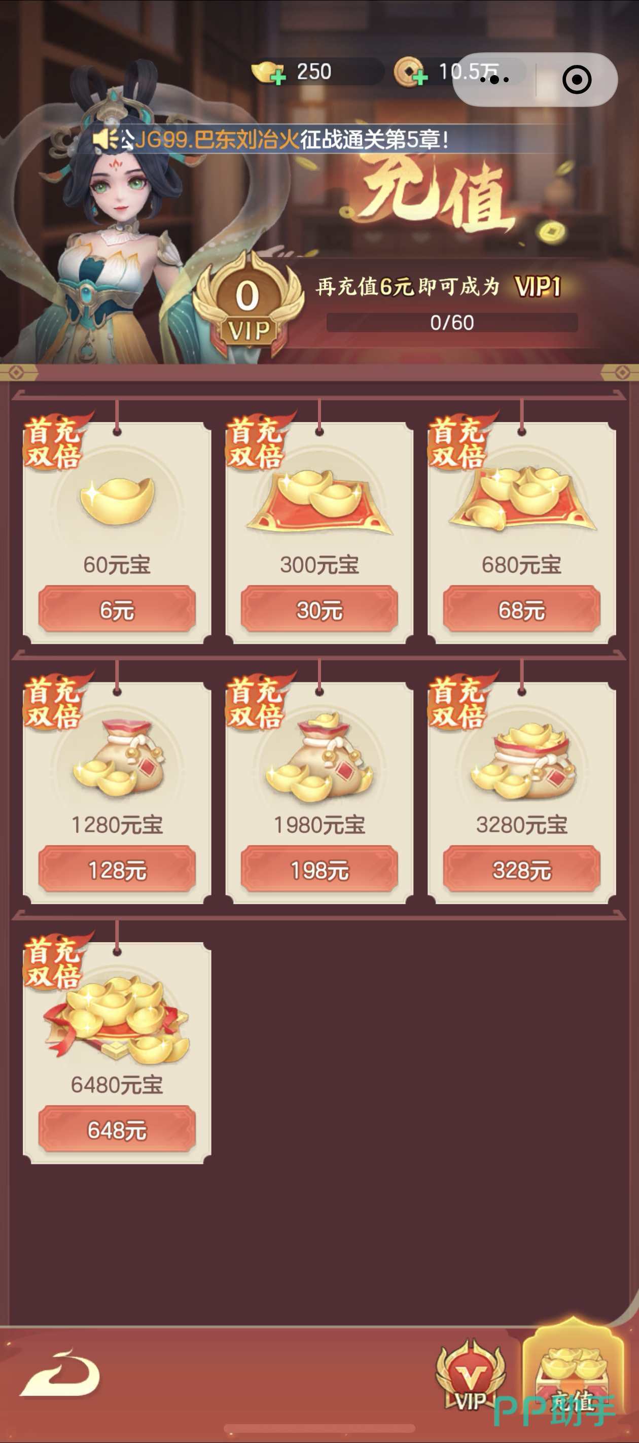 在三国大冒险中,首次充值可享受双倍元宝返还。无论你选择充值6元还是198元,所获得的元宝都将翻倍。例如:6元首充可得120元宝,而198元则直接获得3960元宝。这一机制让每位玩家都能根据自身情况灵活参与,最大化利用初始投入。