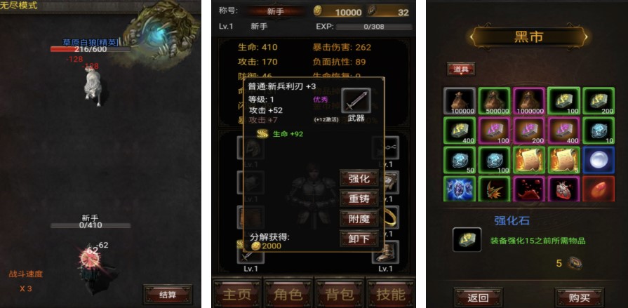 游戏摒弃繁琐操作,战斗全自动进行,解放双手,让你一边喝茶一边看战斗进度条疯狂推进。但别以为这是个轻松的旅程,随机神器、特殊装备、隐藏怪物,每一次挑战都可能带来意想不到的惊喜。黑暗风格的画面沉稳不刺眼,既保留了暗黑系列的神秘感,又适合长时间游玩。在这里,刷装备不再是枯燥的重复,而是一次次探索未知的冒险。无论是休闲玩家还是硬核刷宝党,都能找到属于自己的乐趣。