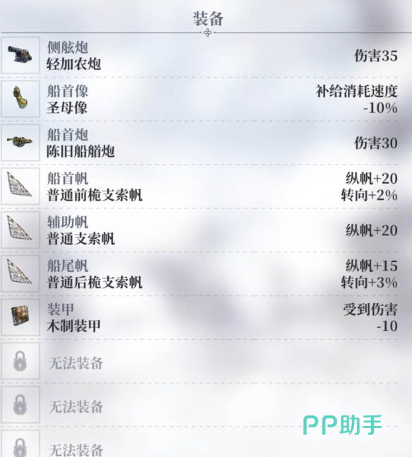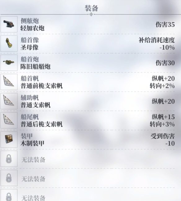 装备兼容性进一步制约其上限。全船仅开放7个装备槽位,显著少于标准主力舰普遍配置的10格。更关键的是装备类型限制严格:主炮、船首像、船帆、装甲四大关键模块均存在不可装配高阶装备的硬性约束,直接导致属性加成效率低下,无法通过装备迭代弥补基础短板。