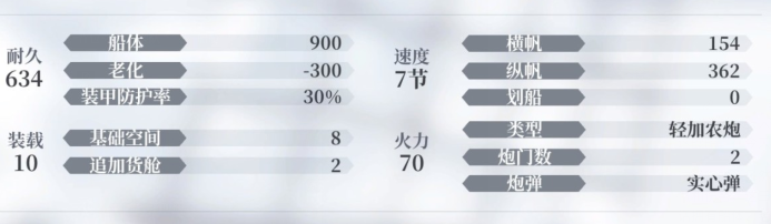 防御与耐久相关参数同样偏弱:船体耐久为900,老化系数为-300(即每场战斗损耗300点结构值),装甲防御率为30%。该组合难以支撑中后期高强度海域探索或PVP对抗。再看机动与承载能力:速度为7,火力为10,装载容量达70——仅装载一项具备实用优势,其余两项明显低于主流中期战舰基准线(速度≥9、火力≥12为常见过渡门槛)。