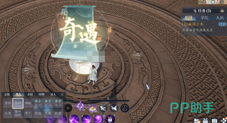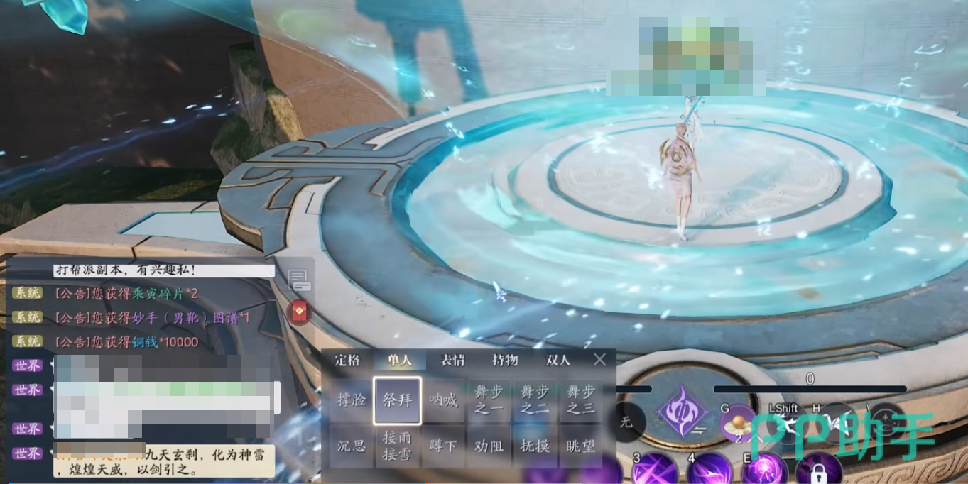 2.尊师重道:传送到台子中部后转身飞行至目标点,坐标为(16539,18360)。站在平台正中心,打开聊天界面选择“祭拜”动作执行一次即可完成。