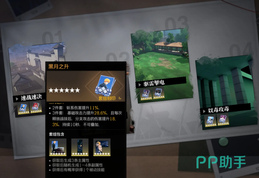 若暂时无法凑齐四件套,也可先以两件套为核心构建输出体系。需注意的是,三件同属性套装并不会带来额外增益,因此不建议强行混搭。若仅有两件“黑月之生”,剩余部位可选择单件“黑月之声”搭配其他提升暴击率的散件进行补充。