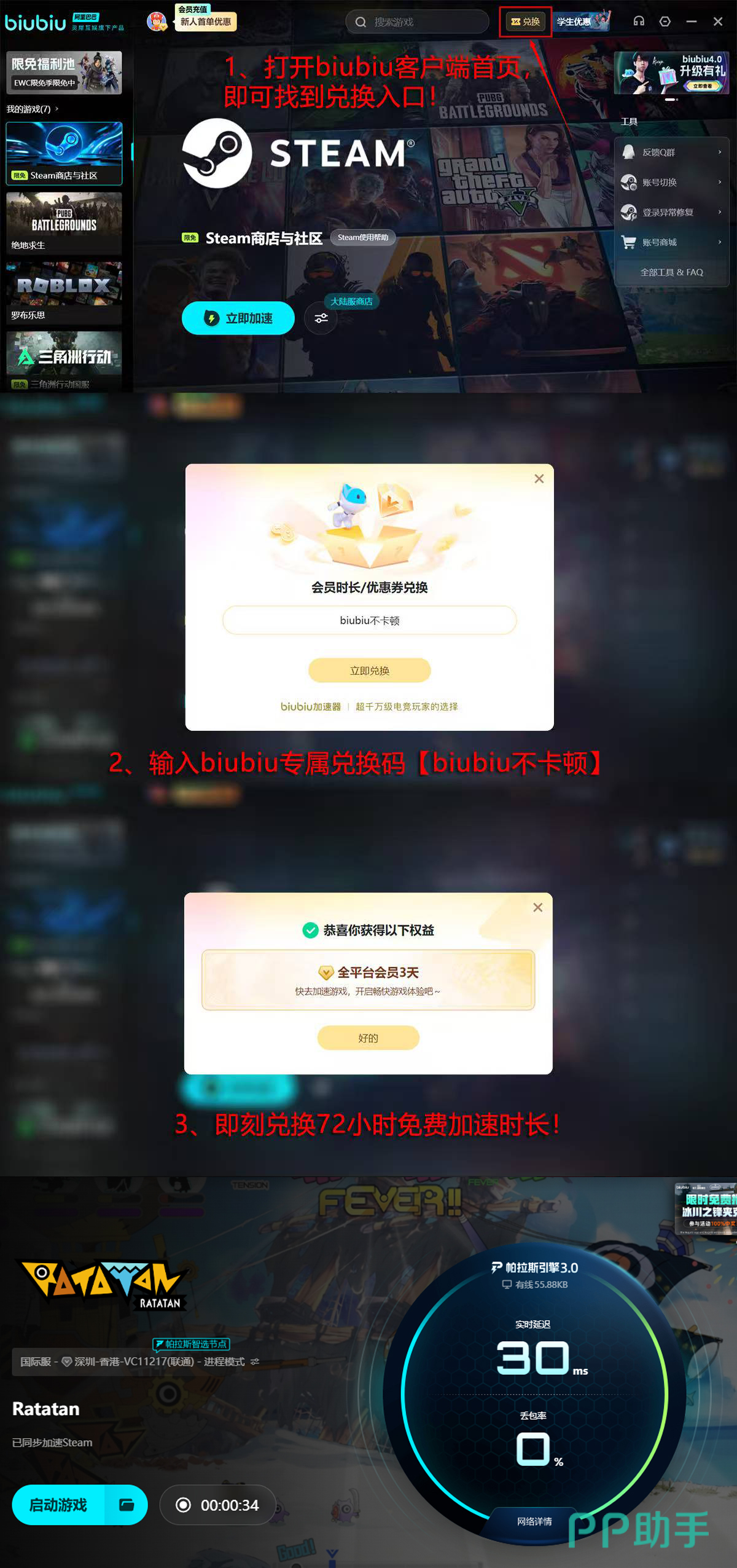 值得一提的是,本次版本升级特别邀请冠军选手Aixleft参与调优,共同打磨出更符合竞技需求的用户体验方案。为回馈广大玩家,官方现推出两项限时福利:新用户注册即可领取24小时免费加速时长,同时所有用户在应用内输入口令【biubiu不卡顿】均可兑换3天加速权益。新用户可叠加参与两项活动,最高可享累计96小时的免费加速服务。
