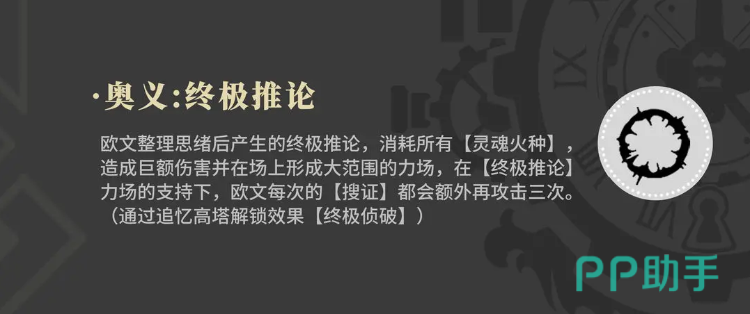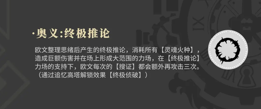 奥义技设定上,欧文可消耗全部灵魂火种对目标造成高额伤害,并展开大范围领域立场。在此领域内,每一次普攻都将获得额外三次攻击次数加成,极大提升输出密度。该技能亦可通过追忆高塔升级,解锁“终极侦破”效果,进一步释放潜能。基于其全面且自洽的技能逻辑,欧文在前期测试阶段便稳居T1梯队,被广泛认为是兼具单体爆发与团队适配性的优质选择。此外,其多段攻击模式与多种资源转化机制,能良好契合各类装备词条,带来更高的配装自由度与成长上限。