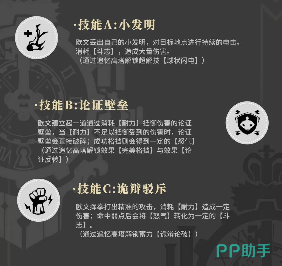 技能体系方面,欧文具备攻防一体的综合能力。一技能“小发明”允许他向指定区域投掷电击装置,持续对范围内敌人造成伤害,并消耗斗志释放,配合追忆高塔解锁的超解技“球状闪电”,进一步拓展远程压制手段。二技能“论证壁垒”为核心防御技,通过消耗耐力生成防护屏障抵挡攻击,成功格挡后可获取怒气奖励;若在追忆高塔中完成进阶,还可激活完美格挡与论证反转机制,显著增强生存效率。三技能“诡辩驳斥”为高风险精准打击技,需消耗耐力发动强力拳击,若命中敌方弱点部位,则可将当前怒气转化为斗志资源,其强化形态“蓄力诡辩论破”同样需通过追忆高塔解锁。