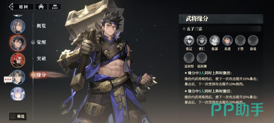 而当暴击发生之后,又会让下一次承受的攻击带有10%的格挡提升,这种设计巧妙地形成了一个攻防一体的循环机制,既增加了己方武将在进攻端的爆发能力,又在防御端给予了一定的补偿和保障,这使得拥有该羁绊的队伍在战斗中能够更加灵活地应对各种情况,所以大家后期在为乐进进行组队的时候其实主要考虑到这个羁绊效果来进行组队就足够了。