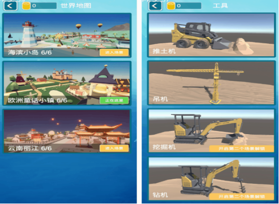 这款采用三个风格所设置的挖掘机游戏,大家可看到独特的画面设计,当你开启了游戏以后,就可看到每个关卡中,都会有相应的任务。无论是建造海滨小岛或者是云南丽江等,各种世界地图,大家都能进入里面,享受唯美的画面表现。同时涵盖了超多工程车工具,包括吊机、推土机等,详细了解每个车子的用途,也能在各种场景当中,通过解锁的方式使用。