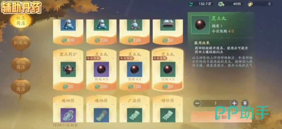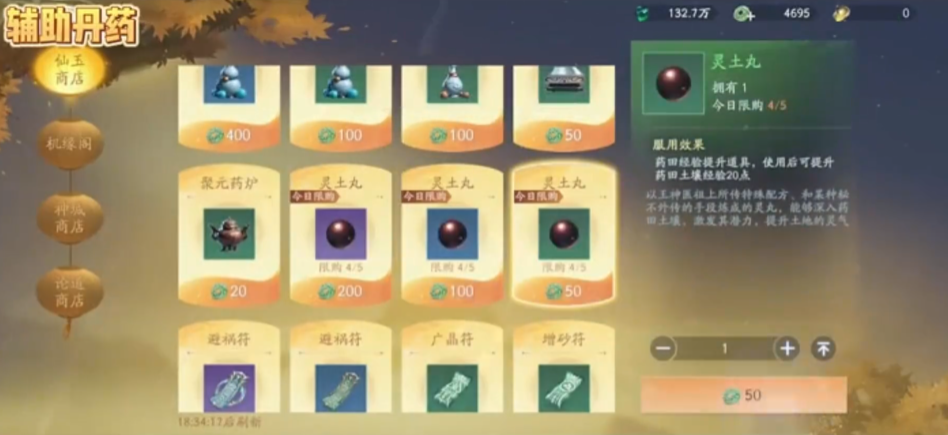 辅助类丹药目前仅上线一种——灵土丸。该丹药不可由玩家自行炼制,仅能通过限时福利活动或使用仙玉在商城内兑换获得。其唯一且关键的作用是提升药田等级,而药田等级直接决定可种植灵药的品质上限,是构建可持续丹药供应链的基础环节。