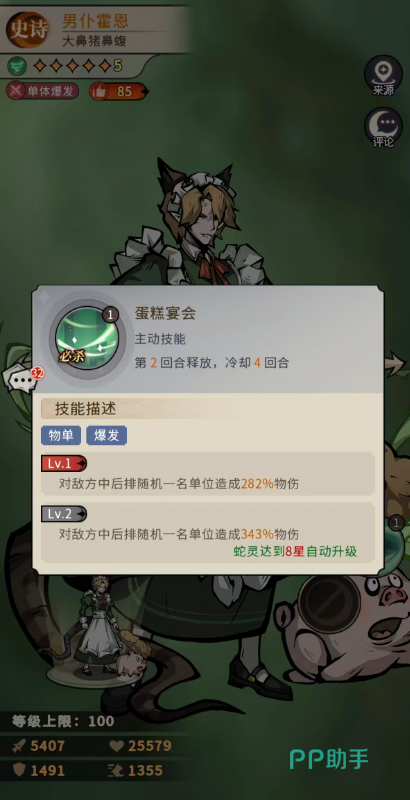 二技能“蛋糕宴会”为霍恩的终结技,释放时随机选取敌方中后排一名单位,造成282%物理伤害;满级后提升至343%。该技能虽具备高倍率单体输出能力,但随机性是其核心限制——无法锁定目标。合理使用策略在于节奏把控:建议在敌方后排减员至1–2人时开启,此时命中主C概率显著提升;同时,该技能拥有4回合冷却,需结合己方行动顺序进行预判部署,避免空耗关键输出窗口。