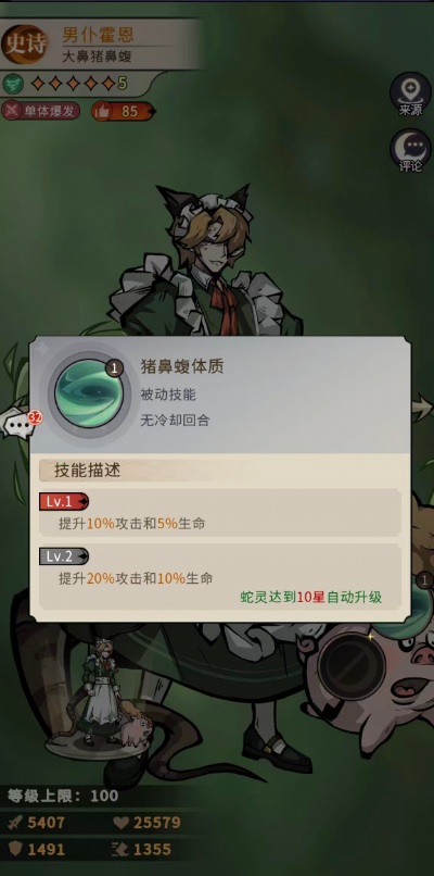 被动技能“猪鼻蝮体质”提供基础属性增益:初始+10%攻击、+5%生命;满级后提升至+20%攻击、+10%生命。该增幅幅度在同品质单位中属常规水平,未体现差异化优势。综合三项技能结构(无群体伤害、无破甲、无治疗、无减益),霍恩的职能高度聚焦于“后排定点清除”,缺乏应对多变战局的扩展能力。这也印证了其设计初衷——服务于前期推图与资源积累阶段,而非长期培养对象。