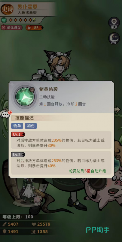 霍恩的一技能“猪鼻偷袭”,初始可对敌方后排单体造成205%物理伤害。该技能不附带控制或状态效果,但存在关键触发机制:当目标为战士或法师类单位时,霍恩自身暴击率额外提升30%。考虑到常规布阵中法师职业普遍位于后排,该加成实际触发频率较高。技能升至满级后,基础伤害提升至253%,暴击率加成同步强化至40%。需注意的是,作为史诗品质单位,霍恩仅拥有1次技能升级机会,无觉醒路径,也缺少传说级蛇灵所具备的第二段技能突破,因此成长上限清晰限定于前期至中期阶段。