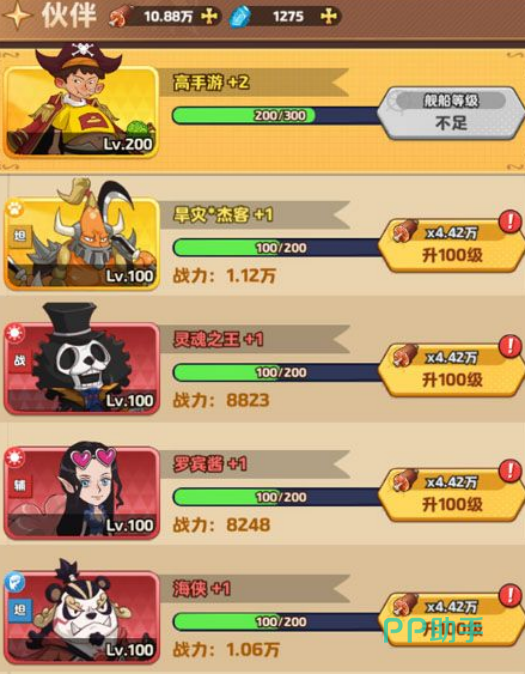 伙伴系统深度绑定船舰成长体系,每位角色拥有独立等级上限,其上限直接受限于主角船长等级(如船长达100级或200级时,伙伴方可突破对应瓶颈)。进阶需消耗钻石,确保战力成长路径清晰可控。此外,传信系统强化角色羁绊互动,提升队伍协同效率。
