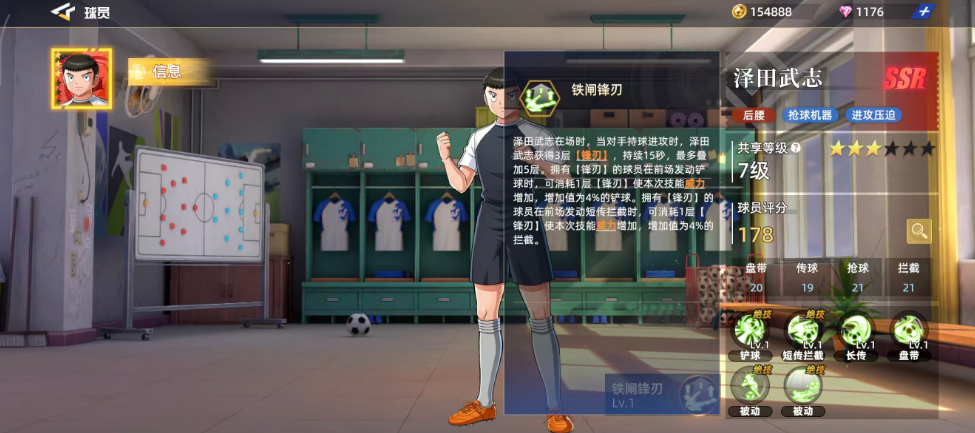 作为一张红色品质的5SR级别球员卡,泽田武志在后腰位置上具备极强的防守压迫能力。其基础属性分别为盘带20、传球19、抢球21、拦截21,整体评分高达178,远超普通SR级球员。尤其在预判方面,他达到了29分,接近满值,展现出顶级的防守意识。此外,在高级属性中,短传与长传均为19,低空抢点和高空抢点也各有16点,进一步增强了他在中场区域的控制力。