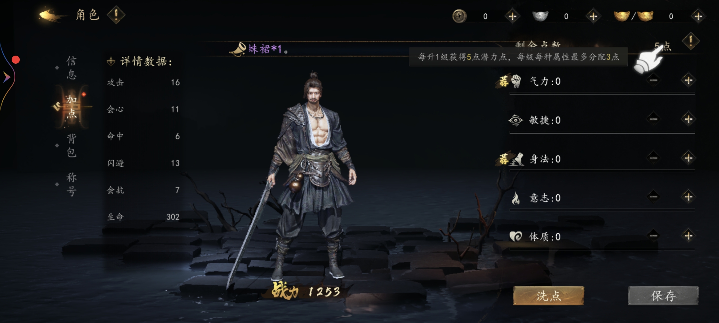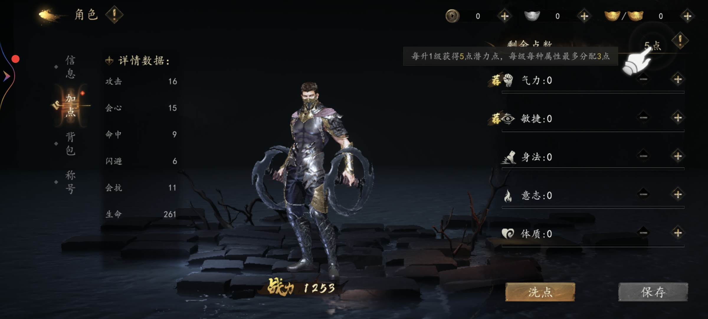 剑阁是一个近战类英雄,这个英雄比较擅长突进和对手正面硬刚,而且这个职业的坦度也是比较不错的。我们再给剑阁加点时就要侧重身法,身法的作用是提高角色闪躲能力和攻击能力,除了主加身法以后,还可以再给意志多加一点点数,提高会心一击的概率。