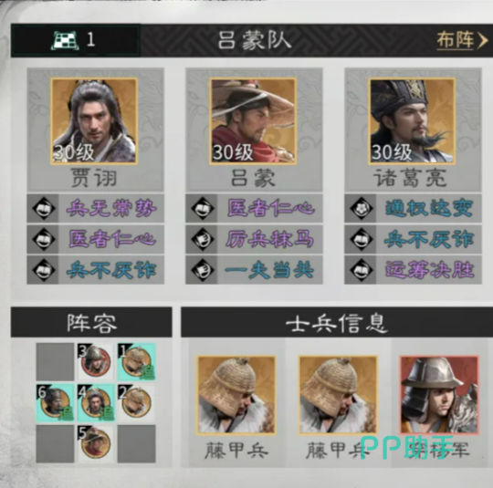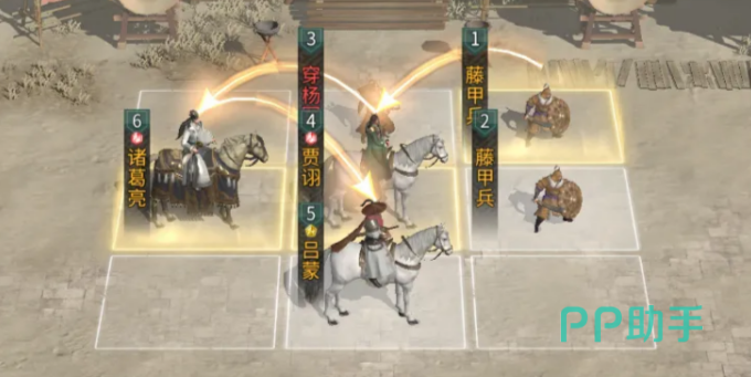 布阵方面,推荐采用“三层纵深站位”:吕蒙置于最前排中央,不占用追击格;诸葛亮紧接其后,占据吕蒙的追击触发位;贾诩则置于诸葛亮的追击格上,完成追击链的最终一环。兵种配置上,连弩军部署于贾诩正上方,两支藤甲兵分别前置在连弩军与贾诩前方,形成双层物理减伤屏障,有效延缓敌方突进节奏,保障后排输出环境安全。该布局虽初看略显复杂,但实际运行中可稳定激活多段追击响应,是整套体系生效的前提。