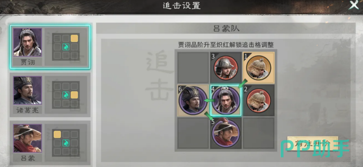 运作机制围绕“挑衅—追击—反击—再追击”闭环展开:吕蒙释放天赋【挑衅】后,立即激活贾诩的追击攻击,并有概率施加【混乱】状态;当敌方单位行动时,诸葛亮触发被动反击,造成伤害并附加控制效果,该控制又再次触发贾诩的追击能力。由此形成每回合至少两次可控追击输出窗口,控场覆盖率与伤害密度同步提升,显著压缩对手行动空间。