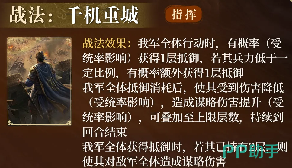 郝昭的核心机制围绕“高生存+强反制”构建。主战法【千机重城】具备双重触发逻辑:全军行动阶段有概率获得1层“抵御”效果;当自身兵力低于50%时,额外再获得1层“抵御”。该效果可有效削减所受伤害,显著提升前排承伤能力。其数值模型明确指向坦克型主将定位,适用于持久战与阵地消耗场景。