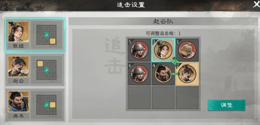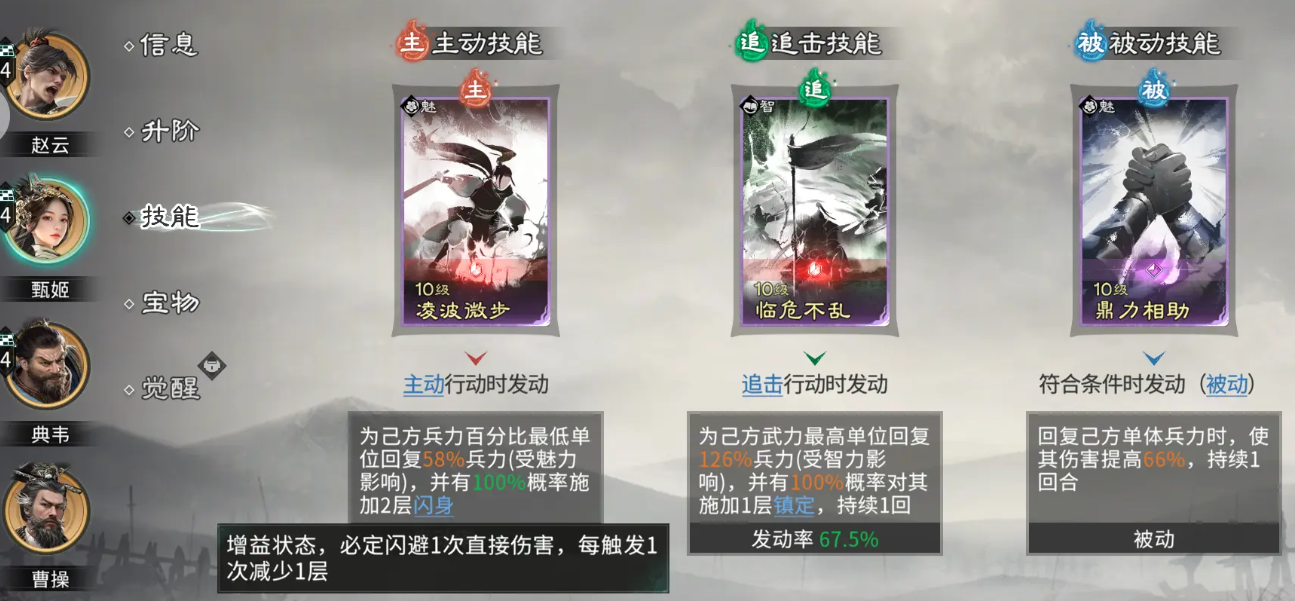 典韦在此体系中承担前排枢纽职能。其天赋“折冲左右”不仅提升自身坦度,更能为相邻的赵云提供免控与减伤保护,并在受到攻击时概率触发反击状态,成为全队反击循环的关键启动点。甄姬则通过天赋为赵云提供兵力回复,若其闪避属性得到强化,还可进一步激活赵云天赋中的右上格追击延伸效果;当甄姬自身处于赵云追击格内时,亦可同步触发其追击技能,形成双向联动。