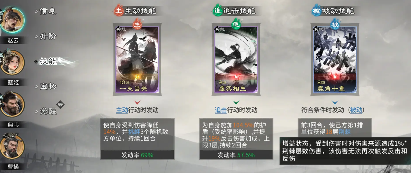 技能配置上,赵云主推“一夫当关”,在承伤瞬间对敌方随机三人施加挑衅,强制其集火自身,为反击创造稳定触发环境;追击技能选择“虚实相声”,可在提供护盾的同时,大幅提升反击伤害倍率,实现“抗伤—反击—增伤”闭环。甄姬主动技能推荐“凌波微步”,使前排赵云获得闪身效果,显著提升其闪避触发概率,从而延长反击链;另一追击技能选用“临危不乱”,优先为武力值最高的友军(即赵云)恢复大量兵力,并附加镇定状态,降低敌方控制命中率,增强队伍容错。