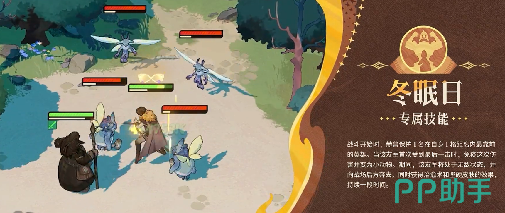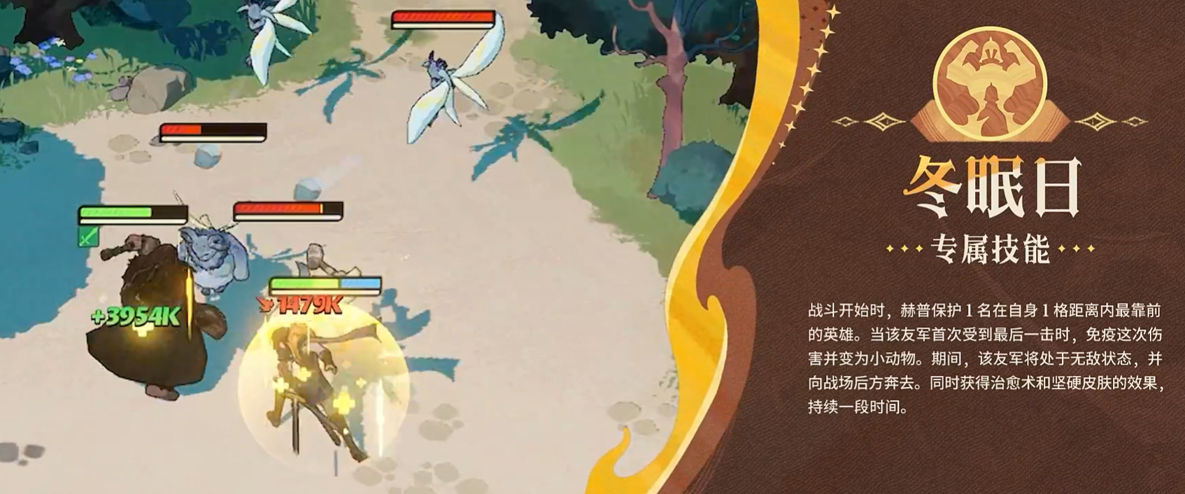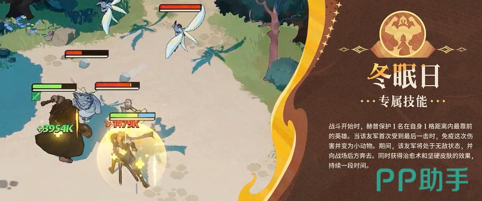 专属技能【冬眠日】赋予赫普独特的战略级保护能力:战斗开始即锁定1格内最靠前的友军,当该目标首次面临致死伤害时,立即触发无敌判定,使其化身为小动物向后位移,同时获得持续治疗与护盾。该机制在高难度挂机关卡中尤为关键,常成为挽救主力输出、扭转战局的核心变量。