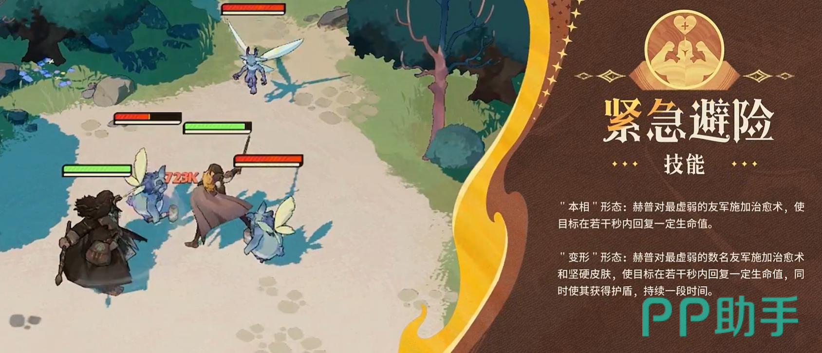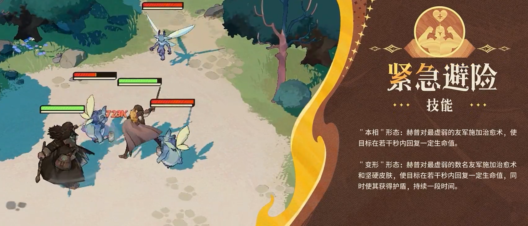 另一主动技【紧急避险】在本相下仅治疗血量最低的1名友军;变形后则可同时恢复至多3名队友生命,并额外赋予护盾。该技能每次使用消耗1点火源,但综合生存增益显著,尤其保障后排核心在赫普承伤期间仍具备持续作战能力。
