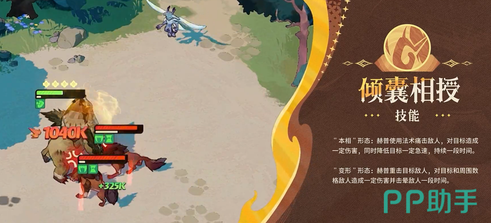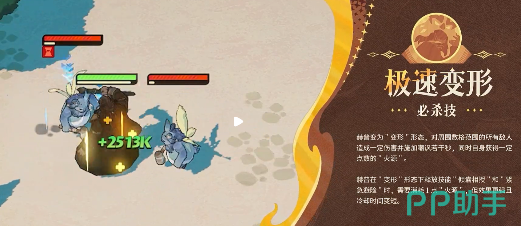 赫普的核心机制在于“本相”与“变形”两种状态的动态切换。常态下以本相运作,承担基础输出与单体治疗;释放必杀技【极速变形】后,立即进入变形形态:对周围敌人造成范围伤害并施加嘲讽效果,同时每秒自动积累1点“火源”资源。该形态下,所有技能效果强化、冷却缩减,整体压制节奏显著加快。