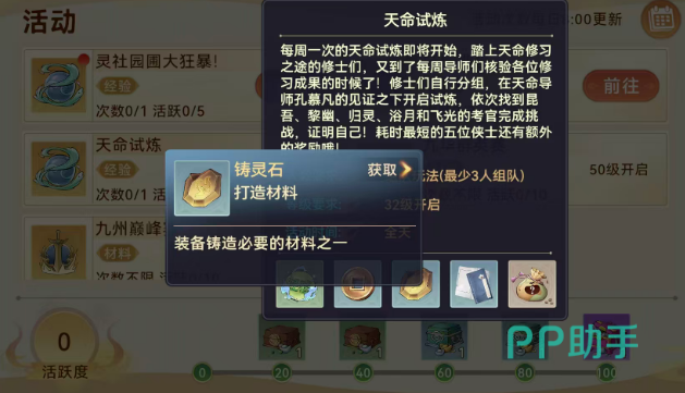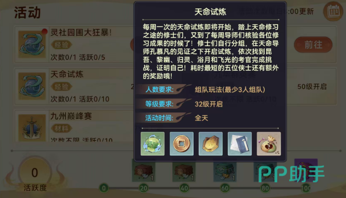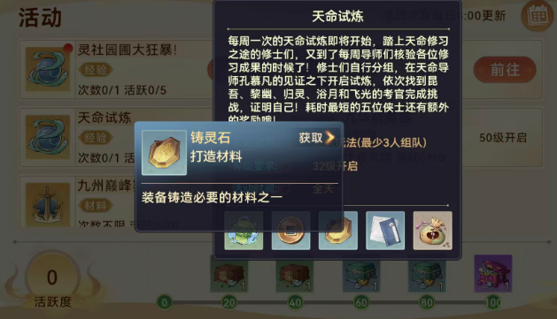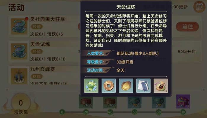 成功通关后,所有队员均可获得固定奖励,包括大量经验、基础货币、铸灵石(用于装备强化)、随机阵法书(提升阵法等级)以及灵石(通用资源)。值得注意的是,天命试炼虽对组队人数下限要求较低,但满员配置能更高效应对考官阶段转换与AOE技能压力,因此推荐以5人小队形式参与。此外,该玩法每日仅可完成一次,完成后可额外获得10点活跃度,是前期快速积累活跃值、兑换成长礼包的关键途径。