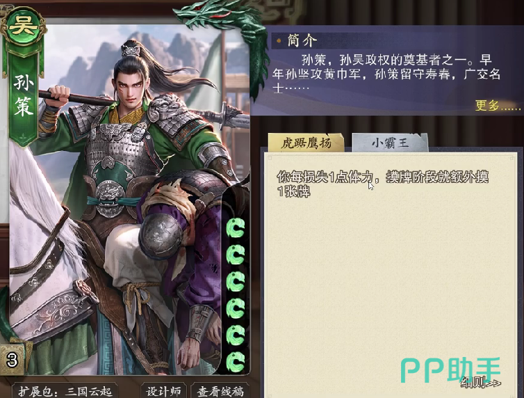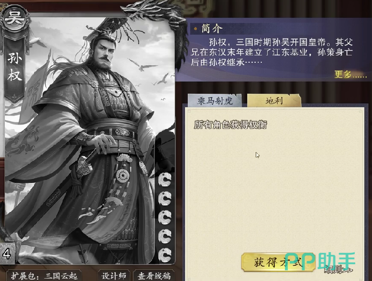 孙权作为辅助类型的武将,他的一技能能够蹭牌,二技能全场制衡,这样的话能够有效的提高整个团队的过牌率,但是自身的输出能力不是特别的好。