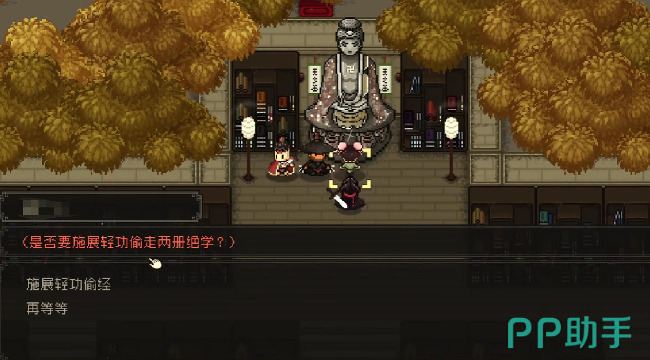 但入寺之后,玩家只能够前往到少林寺的前院,并不能够抵达后院取得“金刚般罗菠萝蜜经”,实际上,玩家也可以直接不进入少林寺,而是通过后山秘境的关卡,挑战守护的武僧,在成功挑战了所有武僧之后,玩家仍然可以取得少林寺的所有秘籍。