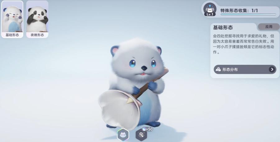 日常活动中,羞羞獭常在泥土中挖掘寻找用于求偶的礼物,但由于过度害羞,屡次告白失败。其标志性动作是用前肢轻揉脸颊,这一细节强化了角色拟人化表现力。该伊莫存在两种形态:常规日间形态与特殊夜间形态。