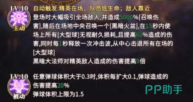 作为特化型魔女,黑暗大法师专精大型球作战体系。其主动技能具备智能触发逻辑——当战场存在精英敌人、我方队员生命值低于安全阈值或敌方单位进入近身范围时自动激活。技能生效瞬间,角色立即生成高额仇恨锁定,对全场敌人造成5000%基础伤害,并在场地中央部署持续15秒的黑暗火盆。火盆生效期间,所有大型球单位免疫耐久损耗,攻击伤害提升60%;同时每秒释放一次中心冲击波,使大型球对精英目标的伤害倍率提升至9倍。