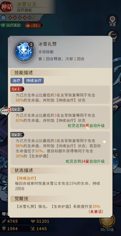 专属技能【冰王冠】赋予关键战术弹性:每回合开始时,若冰雪公主处于控制状态,将立即清除全部控制效果;阵亡瞬间,为所有存活队友进行一次群体治疗,恢复量为自身攻击力的84%。该效果整场战斗仅触发1次,但经强化后,治疗量跃升至133%,极大延缓队伍减员节奏,为后续蛇灵轮换争取宝贵操作窗口。